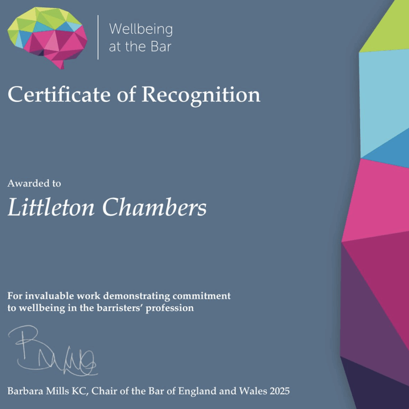 We are pleased to share that Littleton Chambers has been awarded the Wellbeing at the Bar – Certificate of Recognition for 2025.